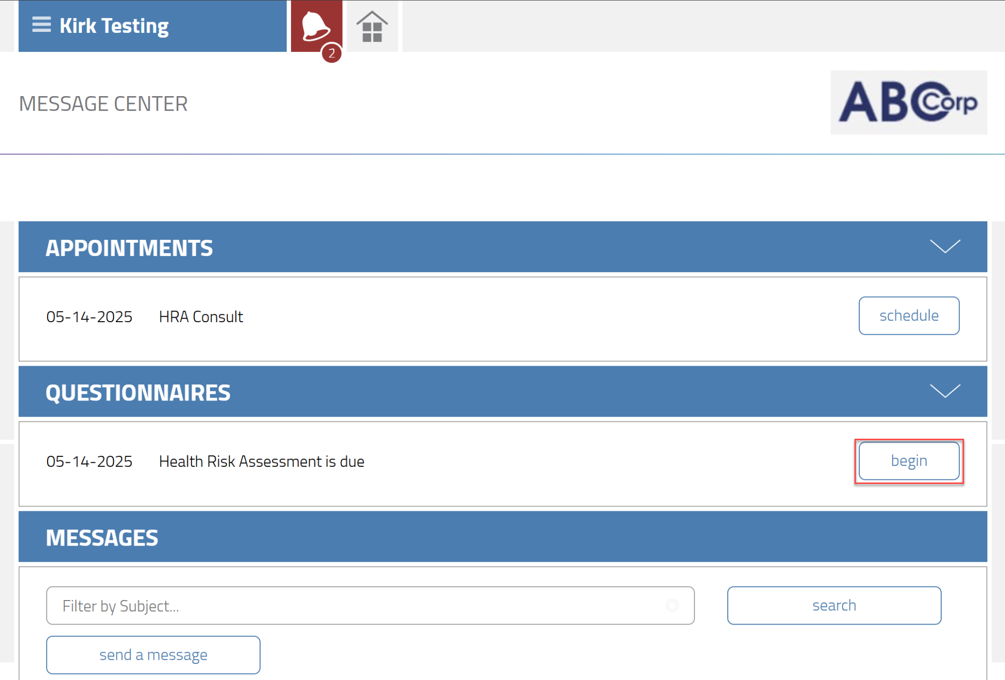 Once the employee is enrolled in the panel, the Health Risk Assessment - Biometric Screening Questionnaire will be available for them to complete on the portal. Click the “begin” button to complete the questionnaire.
