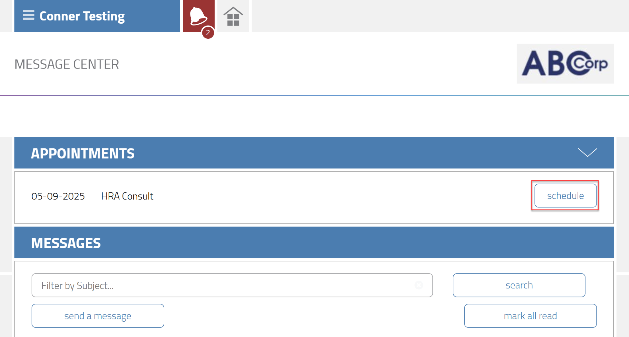 After completing the Health Risk Assessment - Biometric Screening Questionnaire, the HRA Consult Appointment can be scheduled. Click the “schedule” button to schedule the HRA Consult Appointment.