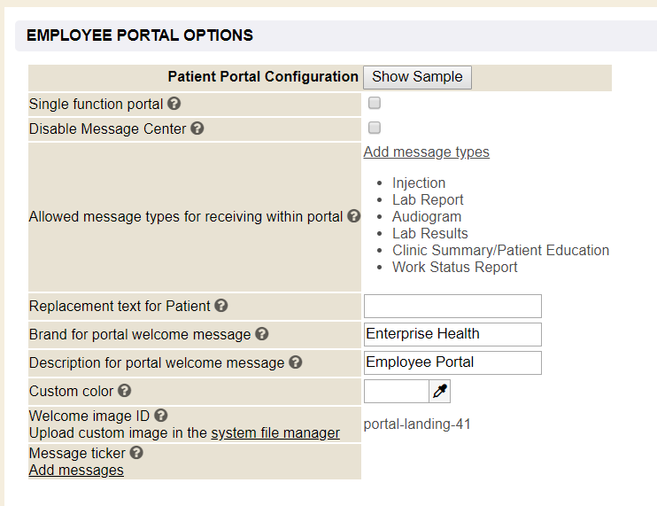 In order to access the portal as a supervisor, users must be established in the Enterprise Health system and have a user-patient relationship set up (i.e., supervisor-employee relationship with each employee chart). To customize and configure each portal individually, users may navigate to the respective tab of the Provider Organization sidemenu. For instance, the Employer Portal tab contains configuration options for the supervisor portal, exclusively. Under this tab, there is an Supervisor Portal Options section, which addresses things such as the ability to disable the message center or configure document types needed for display in the portal, or the ability to add or modify replacement text, labels, tab colors, the landing page image, or even the message ticker.