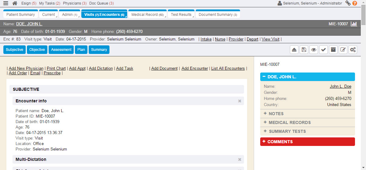 - Also available in the Patient Info toolbar is the side chart icon, which displays patient historical information such as medical records, past encounters, notes and comments.